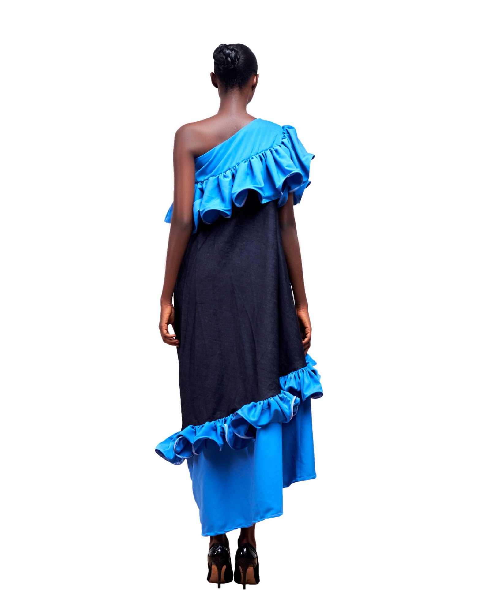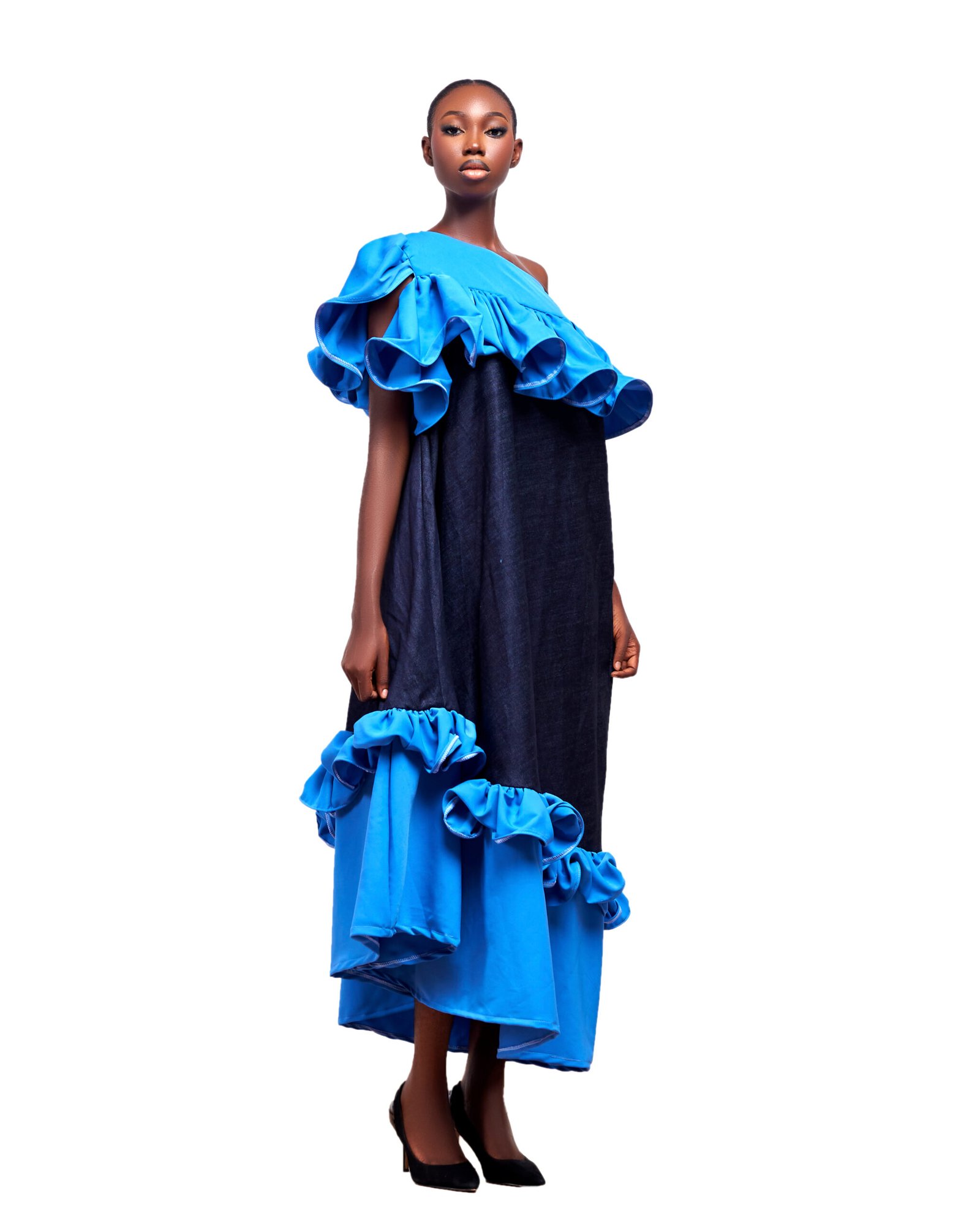 This striking one-shoulder dress brings playful drama to the forefront with its bold cascading ruffles and voluminous silhouette. Designed in a rich navy fabric with vivid electric blue accents, it effortlessly blends structure and softness. The asymmetrical neckline and layered hem create a fluid, sculptural shape that moves beautifully with every step. Whether worn to an artful soirée or a fashion-forward event, it’s a true standout piece that needs little else to make a statement.